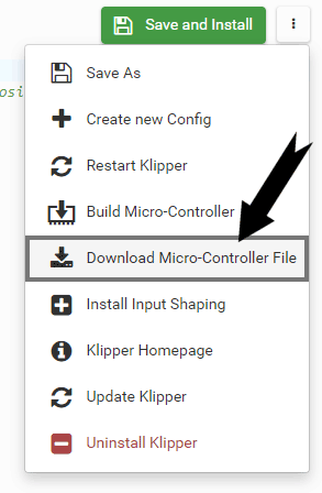 On this page you have now the possibility to create the firmware for the microcontroller. For this click and select Build Micro-Controller. Now a terminal opens with the Klipper Firmware Configuration, where you have to enter your parameters of the board as usual with a Klipper installation and close it by pressing the key Q.