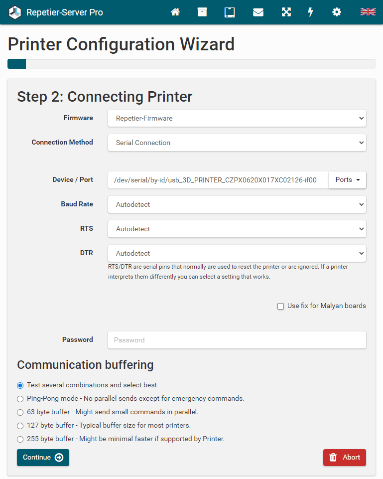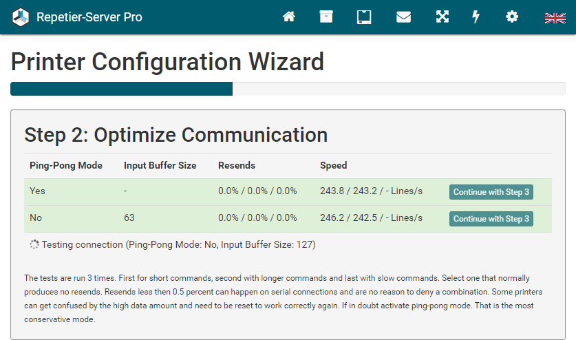 Then the configuration wizard tries to find the optimized communication and tests ping-pong mode and different input buffer sizes. The tests are run 3 times. First for short commands, second with longer commands and last with slow commands. Select one that normally produces no resends.
