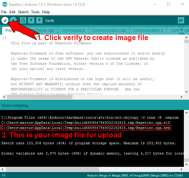 In case of an AVR board you get the option to flash the compiled firmware directly to the printer. Make sure that the printer is connected and select Yes to start flashing. A menu will ask for the right port for uploaded and after selection will flash the firmware.