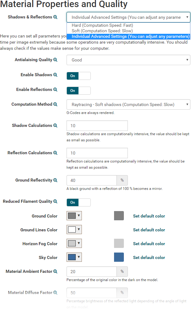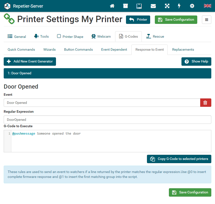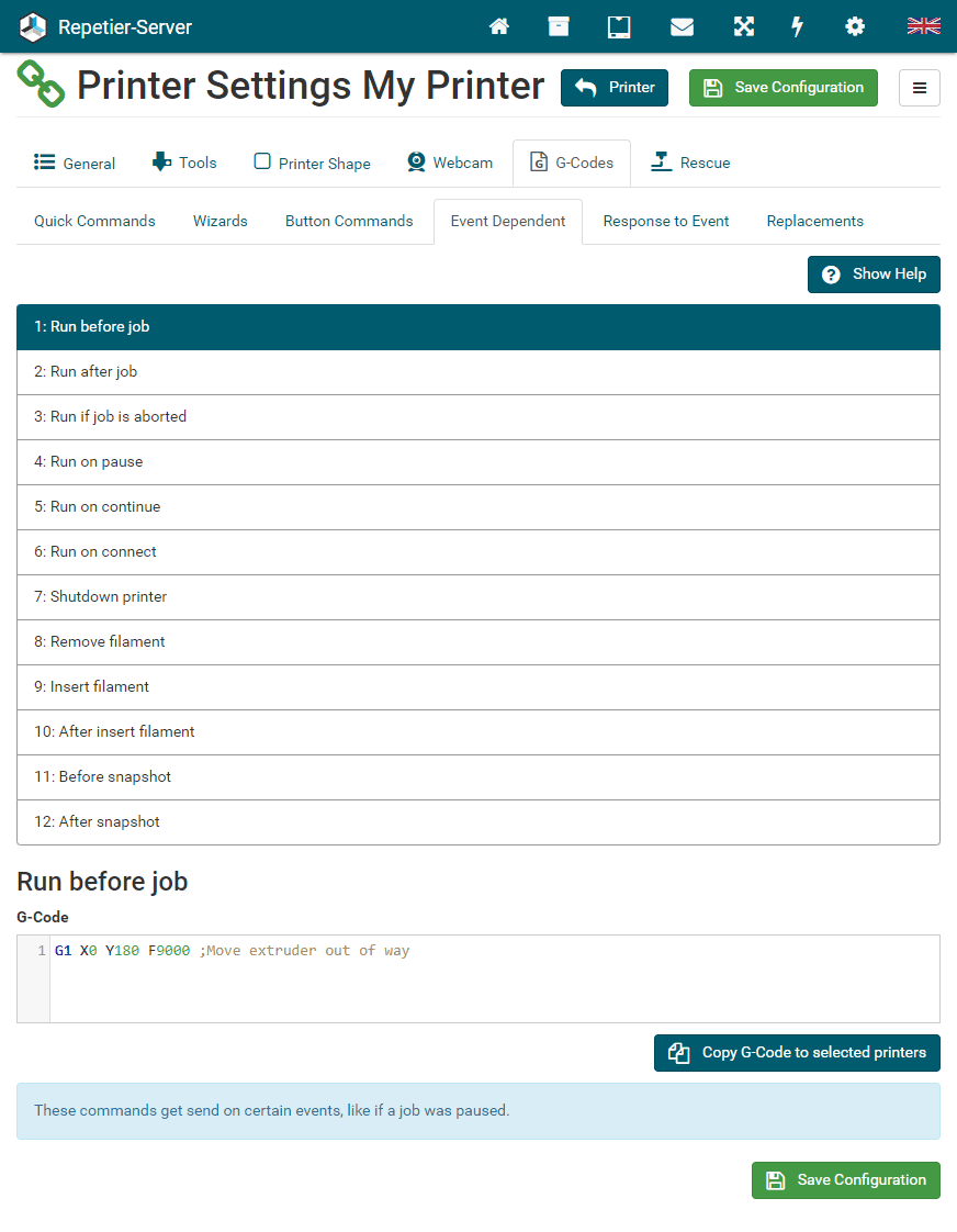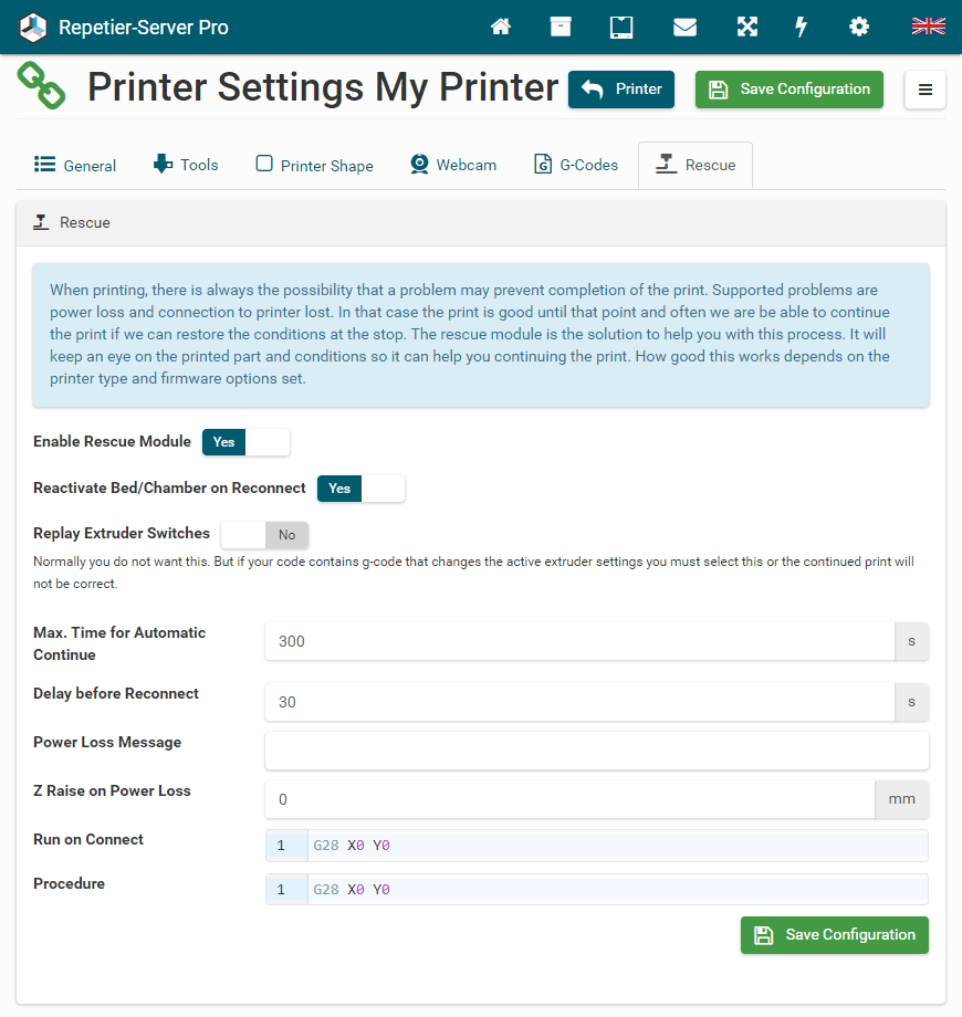 Here you can set all printer related parameter. So it is a good idea, to check these settings once your printer works. The settings are split into several categories to make navigation easier. To save the changed settings, press Save Configuration. If you leave settings without saving, you will get a security question to prevent accidental data loss. For parameters which may be difficult to understand you get a popover with detailed information when you click on the text field.