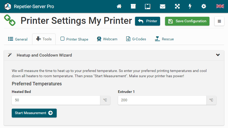 2. Make sure your printer has power! Then enter typical temperatures for extruders and beds, then click Start Measurement.