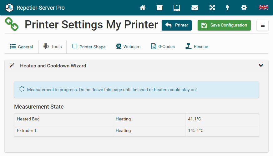 3. Now you have to wait. The wizard tracks the warming and cooling speeds, which will take some time, especially the cooling of the bed is time intensive.