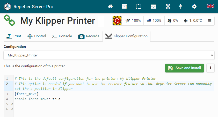 You can also save the Klipper configuration under a different name. Please keep in mind that the configuration with the printer slug as its name always represents the corresponding configuration of the printer. (You can also see that the current configuration is currently used on the text "# This is the default configuration for the printer:".)