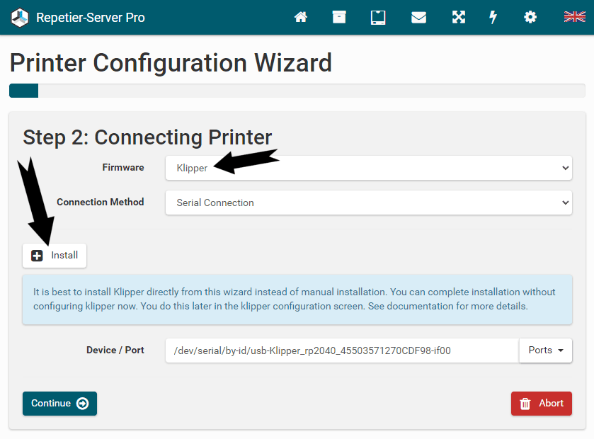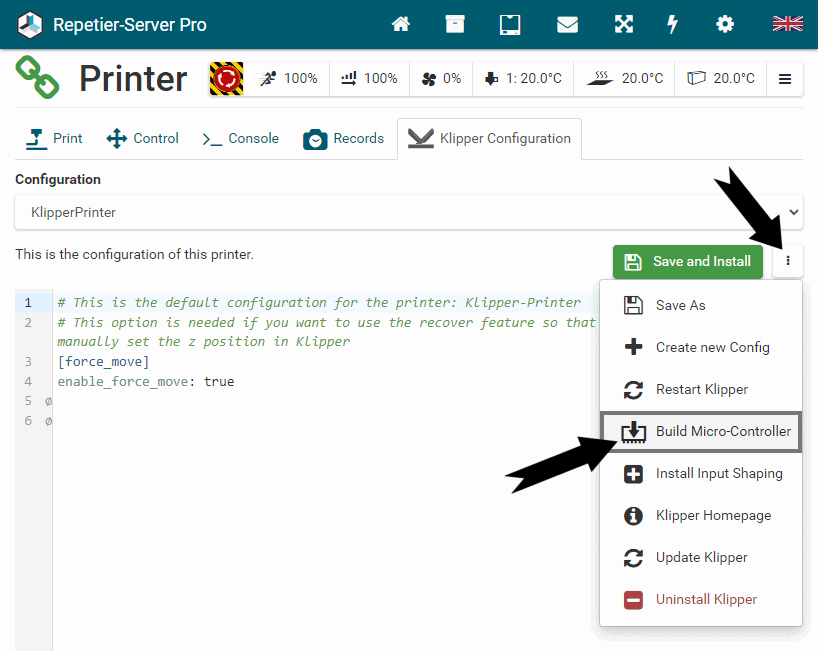 Repetier-Server Pro supports the guided installation of the firmware Klipper on your devices. To install Klipper, select the Klipper firmware during printer creation. The button Install appears. When you click this button, a menu appears that installs all dependencies and installs Klipper properly. Note that the default path of the installation is not /home/pi/klipper as in a normal installation but /opt/klipper/SLUG and this directory belongs to the user "repetierserver" and is therefore not accessible with the user pi.