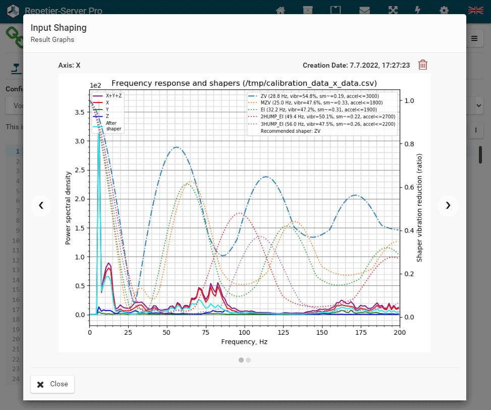 The results graphs can be viewed at any time on the Klipper configuration page by pressing the Show Input Shaping Graphs button. Every new test adds one picture per axis, so check using the shown date if you are watching the correct images. WIth the button you can delete the images any time.