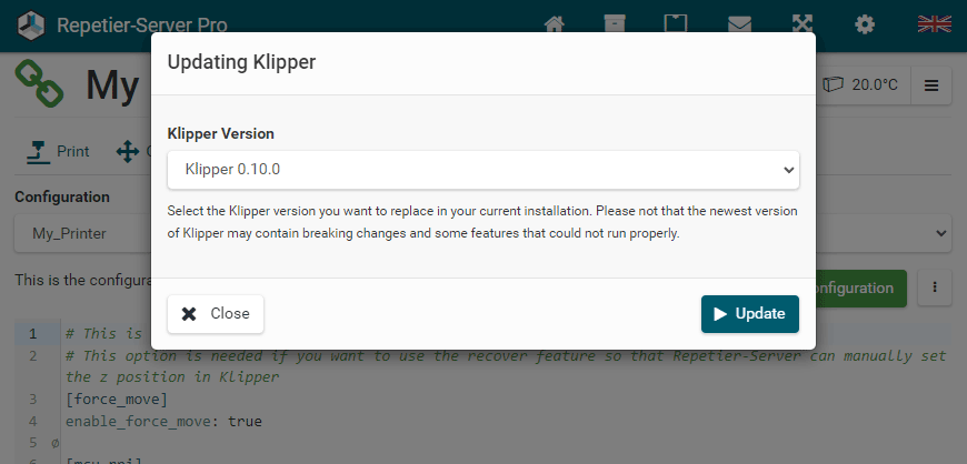 If your Klipper installation is outdated or you want to revert to a specific version, we offer with Update Klipper the possibility to install either the latest version or supported versions verified by us. Therefore, select the version you want in Update Klipper and it will automatically update or downgrade to that version. Please be aware that you may need to make some changes in your Klipper configuration if some entries or sections require different a configuration between those versions.