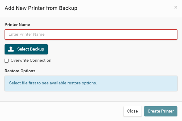The easiest way to set up a new printer is to upload an existing backup file. Go to and click on Upload Printer Backup. Enter a printer name, select the backup file.
