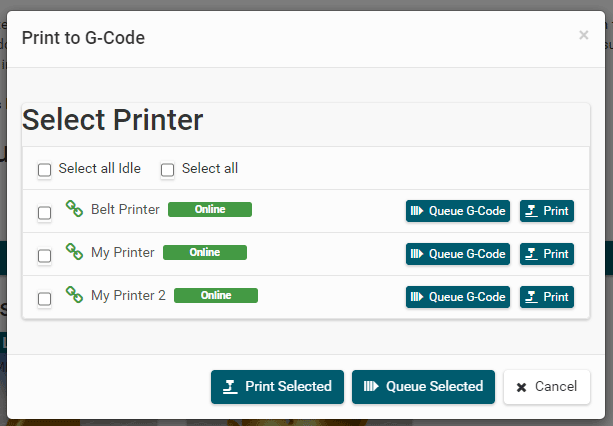 You can call the event dependent g-code script "Shutdown printer" when the printer is the set time idle and the extruder temperature is already below the set threshold in "Idle max temperature" field. If the time is 0 this feature is disabled. Also this is named power of it actually does nothing in standard configuration. It is just, that this is the typical intention, but there is not one solution to power of a printer. Most can not do it at all, so solutions are to use a wifi controlled plug instead in most cases. And these have all different solutions and required parameter. So we give you a script where you can add what works.