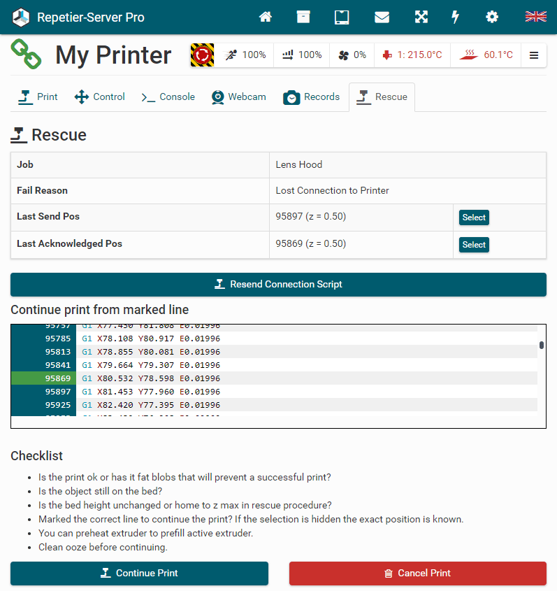 Continue print after fast reconnect